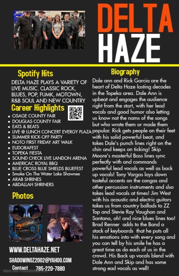 Dale Ann and Rick Garcia are the heart of Delta Haze lasting decades in the Topeka area. Dale Ann is upbeat and engages the audience right from the start, with her lead vocals and good humor also letting us know not only the names of the songs but who wrote them or made them popular. Rick gets people on their feet with his solid powerful beat, and takes Dale's Ann punch lines right on the chin and keeps on ticking! Skipper Moore's masterful Bass lines sync perfectly with Rick and commands powerful lead vocals as well as back up vocals! Tony Vargas lays down tasteful accents on the congas and other percussion instruments and also takes lead vocals at times! Jim Wesr with his acoustic and electric guitars takes us from country ballads to Z Z Top and Stevie Ray Vaughan and Santana, oh! and nice blues lines too! Brad Renner adds to the Band a stack of keyboards that he puts all his emotions into with every song and you can tell by his smile he has a great time as do each of us in the crowd. His Back up vocals blend with Dale Ann and Skip and has some strong lead vocals as well !